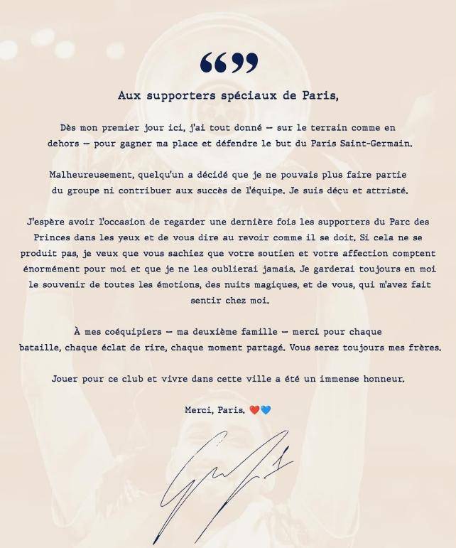 多纳鲁马详述了他选择离开的缘由:“自从我踏入巴黎的那一刻,我便竭尽全力,无论是在比赛中还是场外,都在为证明自己而努力,以及捍卫巴黎圣日耳曼的使命。遗憾的是,一些人的决定让我无法继续为球队贡献力量,这让我感到深深的失望和伤心。”他在最后还对球迷和队友表示了衷心的感谢。